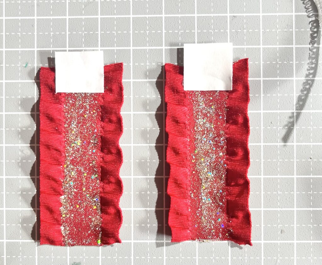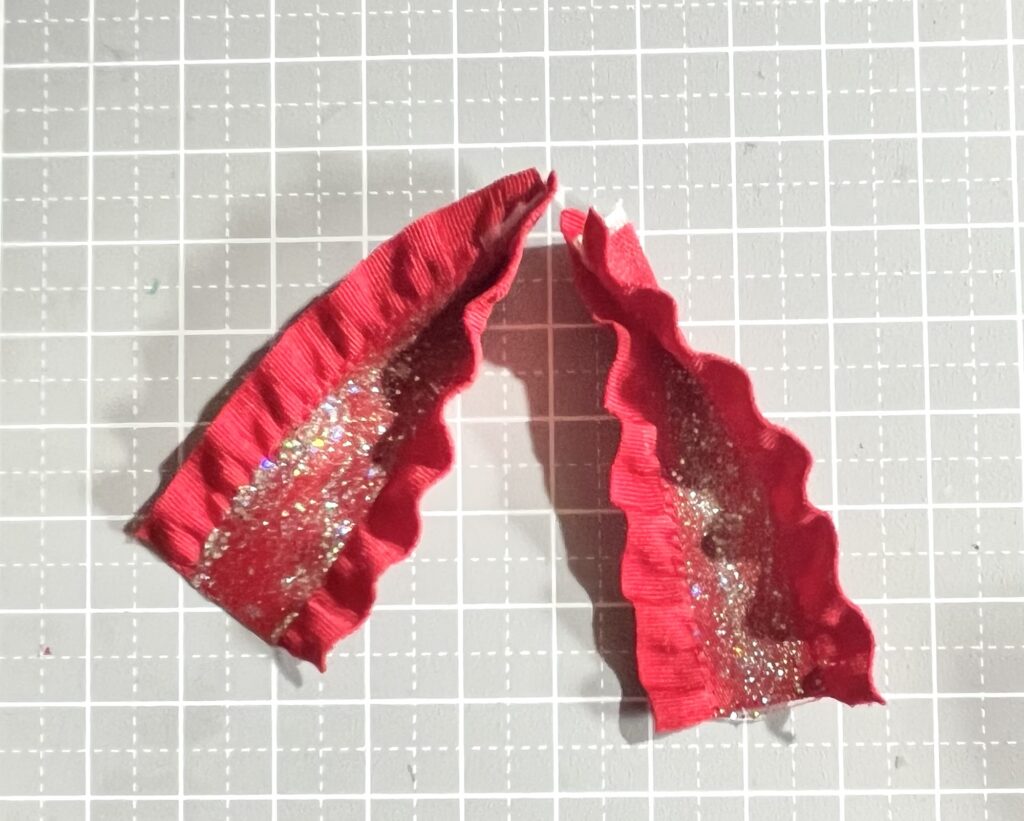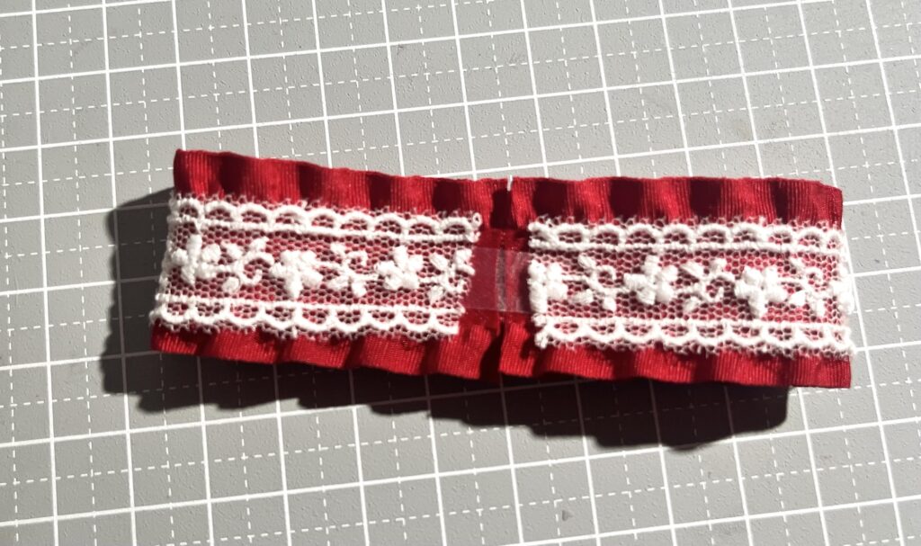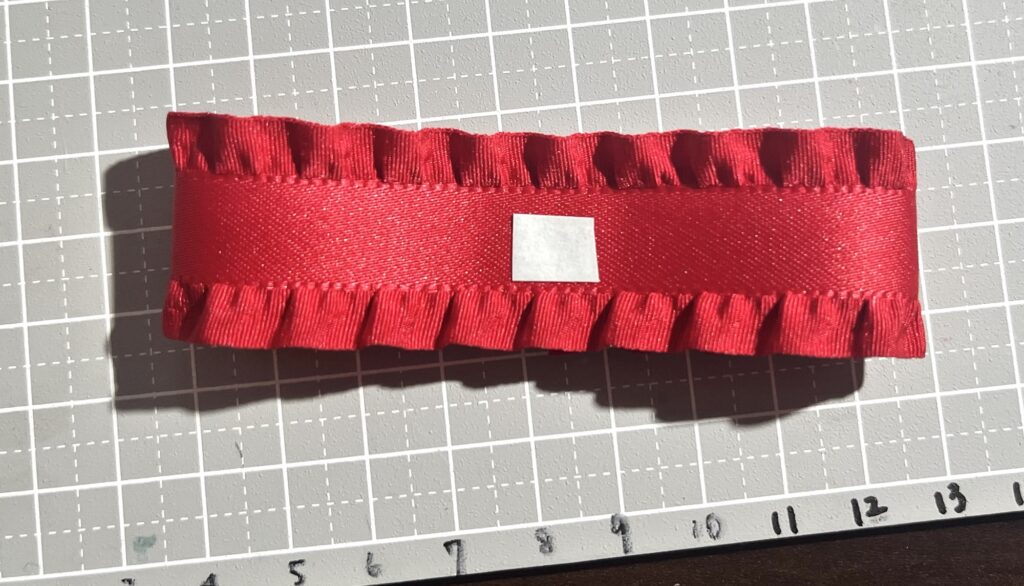 動かないように両フリルの中心(リボンの両端が見える裏)に両面テープをつけます。