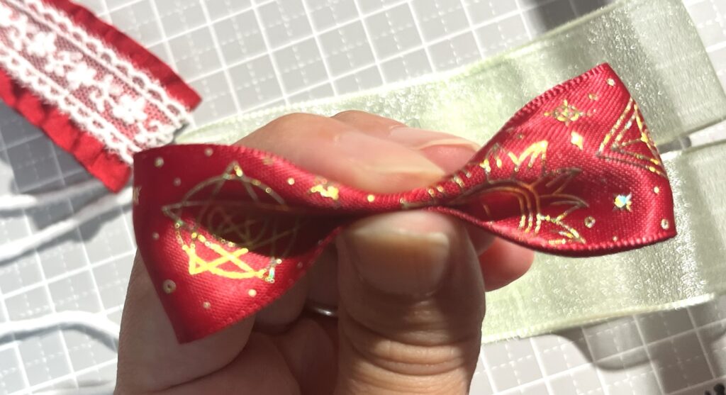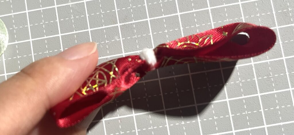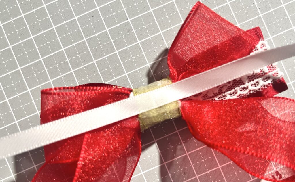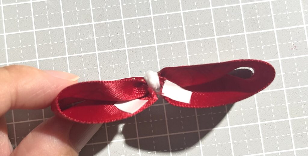 リボンが綺麗な形になるように、指で形を整えて、リボンの中心をゴムか紐で結びます。