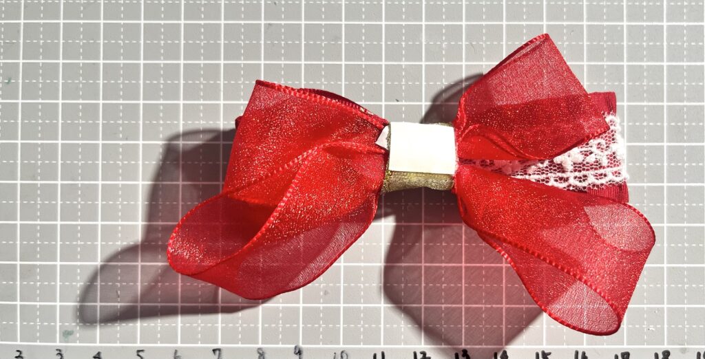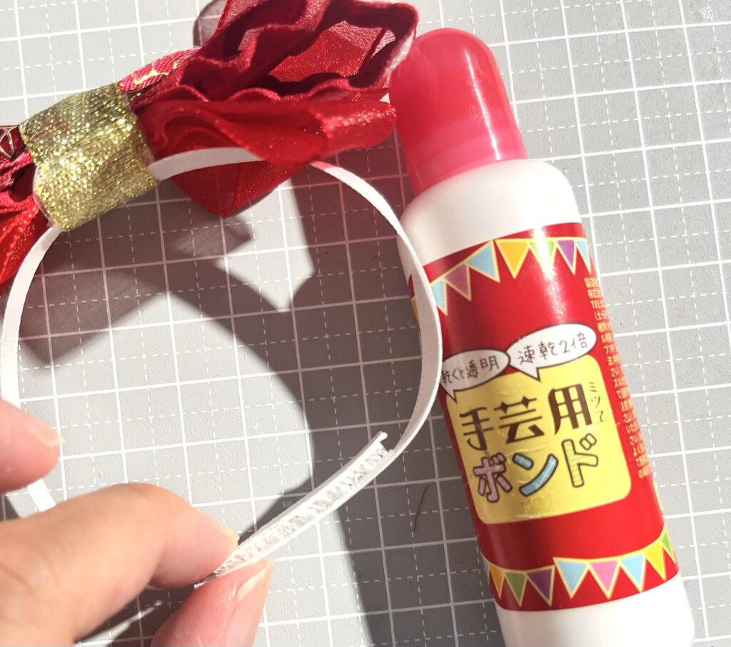 最後に形を整えるために目立たないところに両面テープを貼ってリボンが綺麗に重なるように調整。